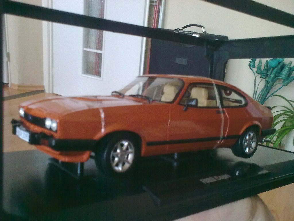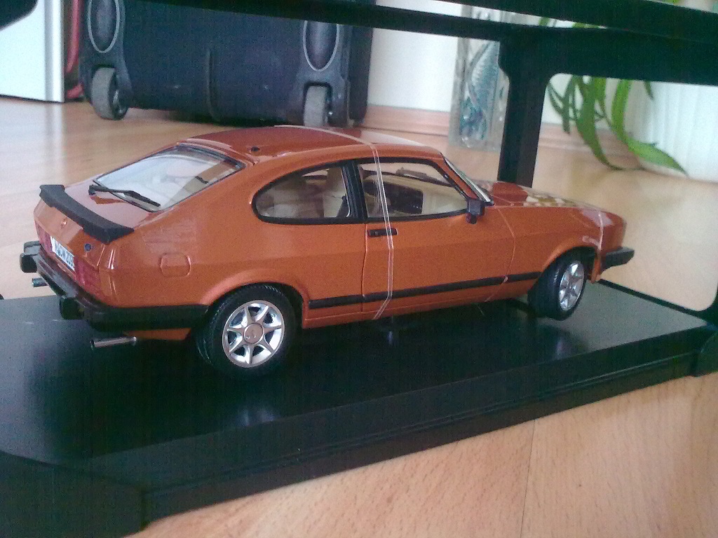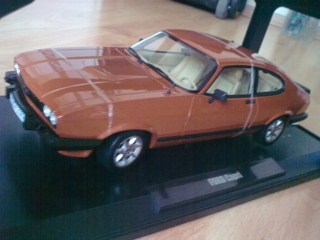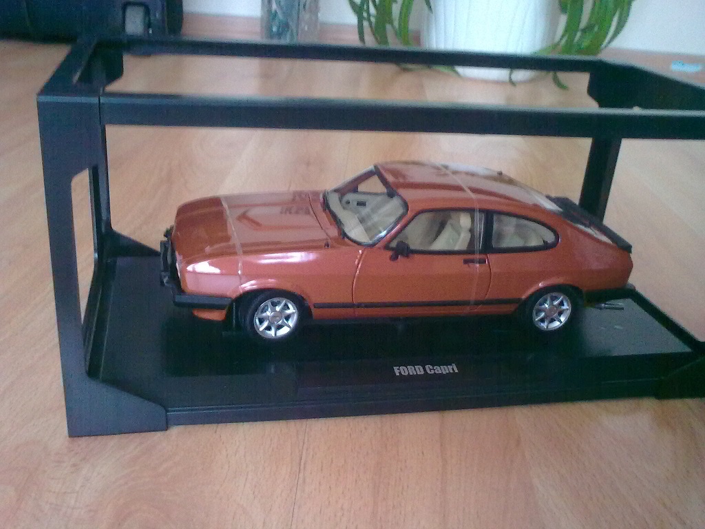 Sajnos a nagyobbiktól jó ideje már meg kellett válnom ,a kis testvér azóta is itt maradt emlékbe a vitrinembe,,, a "projekt " lényege az volt hogy átalakítani úgy 1 modell Ford Caprit ,amilyen a sajátom élőben,,Így az autó színe ugyan az lett,és a felni színe is + az oldal csíkozás + a kocsin a tulaj neve mint az eredetin.(mégha a 10 -en éves kifakult képeken nem látszik pont ugyan olyannak)