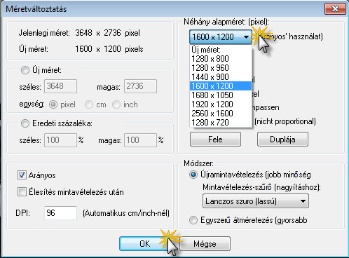 A jobb oldalon a ‚Néhány alapméretnél’ a legördülő menüből kiválasztod pl.: 1600 x 1200 méretet majd mehet az OK -gomb
