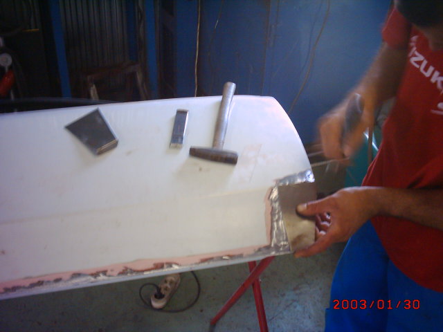 Ma délután szalad be az egyik kasztnis mesterünk hogy: "Nagy baj van Laci, gyere ki a műhelybe"...........Mondom neki: Mi a f@sz van má megin???Elfogyott az alvázvédő? Vagy mi?? Á nem, csak a bal oldali ajtódat akartuk kijavítani és feltenni de a zsanérok mentén és az alsó részen a korongozás után teljesen szétmállott az anyag!!Egyszerűen menthetetlen csak a gitt+a festék fogta eddig. Kimentem megnéztem, és azonnal seggre ültem