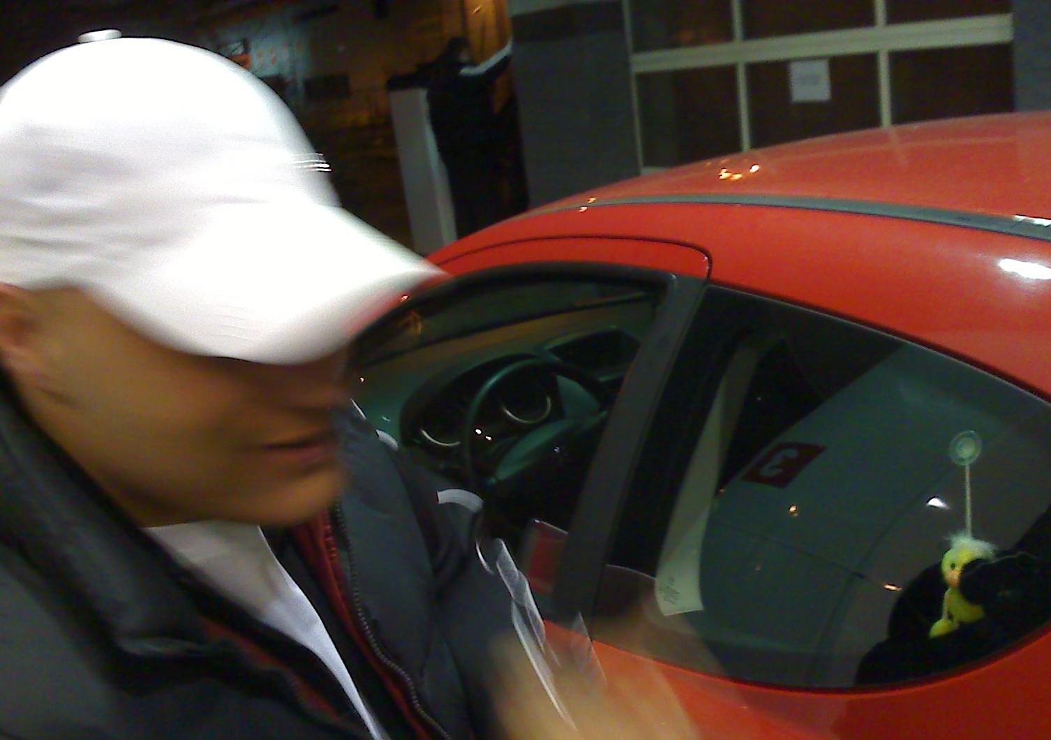 Egy fehér sapkás ember egy piros autó előtt :D :D
