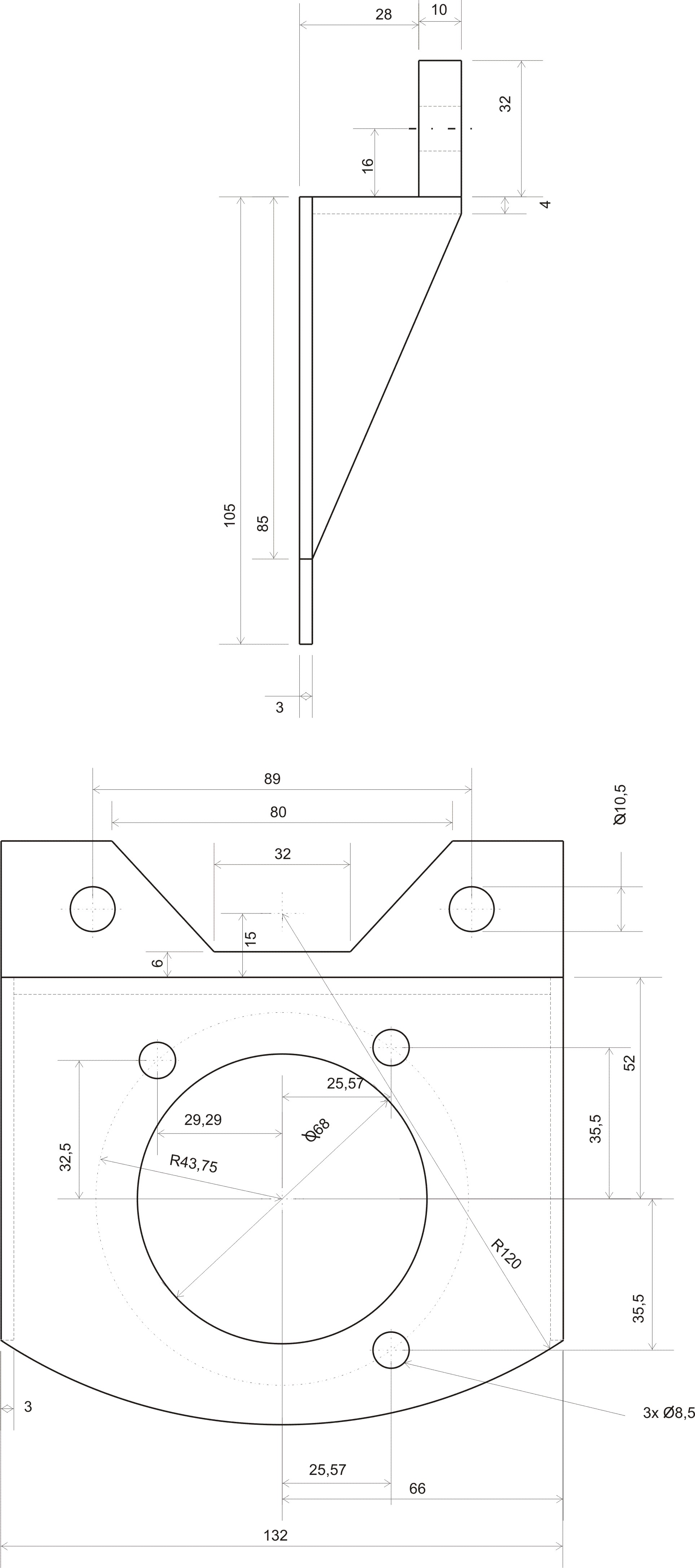 na itt egy rajz. Sajnos a 4. furat méreteit nem sikerült lelopnom a Gabe féle rajzról, mert azon nincs 4. furat, ezért ünnepélyesen szeretném felkérni vasparipa urat, hogy egyrész MEO-zza le hogy jó e amit átrajzoltam, és legyen szives megadni a 4. furat koordinátáit. Egyenlőre ez csak az egyik oldali rajza, mert ugye a 4 furat szimmetrikusan helyezkedik el a 2 oldalon. Ez a konzol escort 1.6d első tárcsával müködik, a féltengely külső átmérőjéből le kell venni kb 4 mm-t, hogy felcsusszanjon rá a tárcsa. emitten a rajz:
