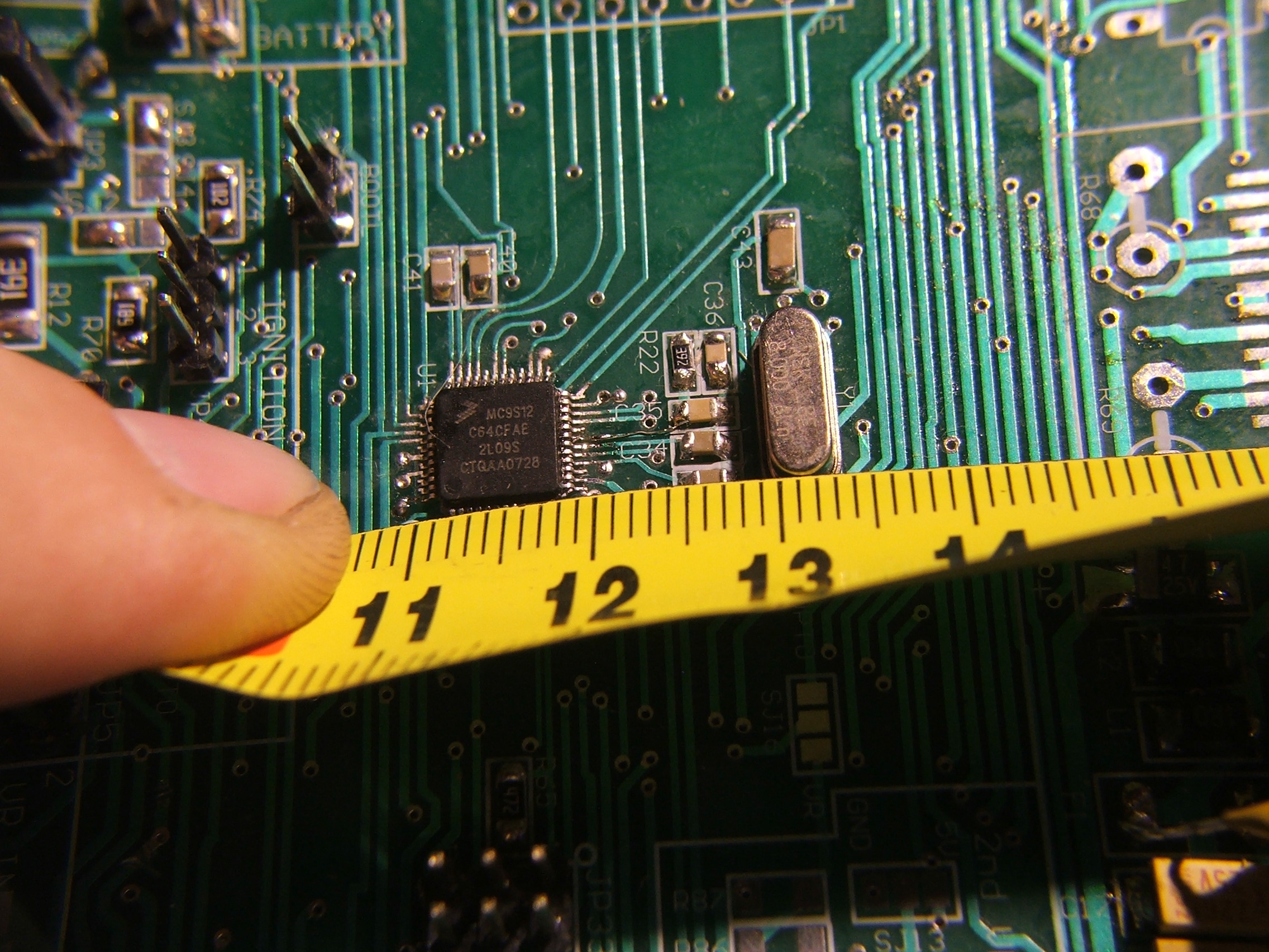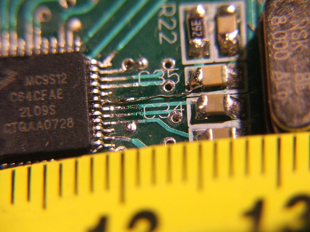 Engedtessék meg egy kis önreklám: erre most elég büszke vagyok, sikerült egy igen finom rajzolatú panelen egy szakadt vezetősávot megjavítani egy "vezeték" ráforrasztásával. Az IC-nek a lábai 0.65mm-re vannak egymástól, és 0.3mm vastagok: