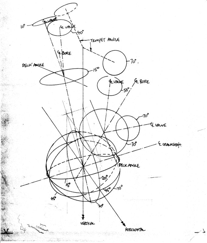 "This is the layout for the cutaway of the terrific Ford Cosworth GAA V6 engine, with the cross-over inlet trumpets. "