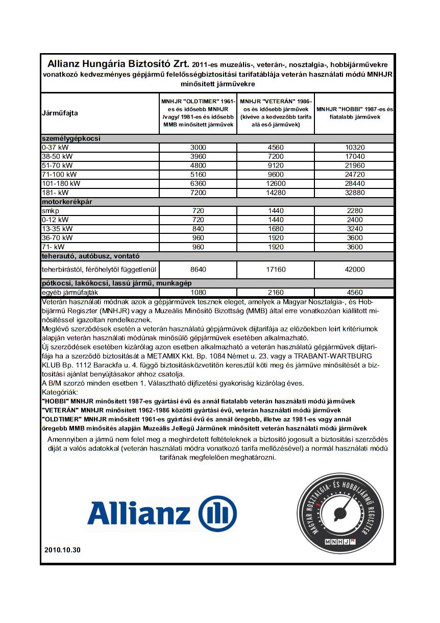 Jövőre változik megintcsak a kötelező biztosítás. Ha valaki esetleg nem hallotta volna, jövő évtől nem a motor mérete határozza meg a biztosítási díjat, hanem az autó teljesítménye. Ez az adat néhány éve kötelező a forgalmiban, mindenkinek be kellett iratni akinek esetleg nem lett volna benne. A két biztosító díjtáblázata akik érintettek a klubon keresztül intézett kedvezményes biztosításban a jövő évre:
