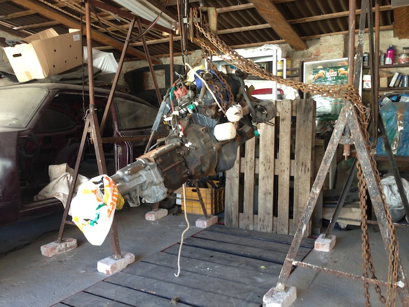 ha alacsony a kőműves állvány, biztonságosan alá kell bakolni 4 db kisméretű tömör téglával (minden autószerelő műhely kötelező tartozéka), majd jobb híjján egy láncos kútgyűrűkiemelővel már ki is lehet pattintani.