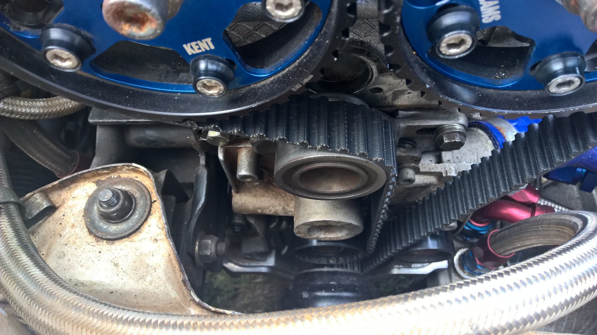 Na itt jött egy kis megtorpanás mert nem találtunk információt arról, hogy a silvertop alja és black top teteje összeházasítása miatt a vezérlést, hogyan fogjuk össze rakni. Ezért a tudásért egészen Silverstonig kellett elutazniés a tudást meg szerezni. Silverstonban találtunk egy ilyen motort amiről meg tudtuk, hogy az 1.6 cvh nak a szíj feszítőjét kell fel rakni a motorra mind összesen 1 db lyuk ki fúrásával.