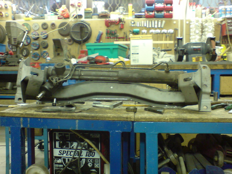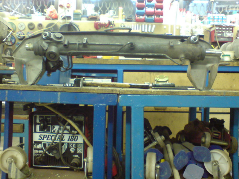 A kormánymű kissé jobbra van a középtóől és bár a ház hossza megegyezik a régijével, a fogasléc hosszabb, így a jobb oldalon valószínűleg rövidebb lesz az nyomtávrúd! A jobb oldali felfogatást kissé lejjebb helyeztük (1-2 mm, többet nem mertünk), hogy fölemelt állapotban se törje el az irányítókart! Ha így is gáz, vágok a fogasléc végéből, és tovább fúrom benne a menetet. A kormánymű annyira pöpec, hogy még gumiharangot és axiálcsuklót sem kell rá vennem, csak a nyomtávrudakat rövidebbre vágni és megfelelő menetet rá!