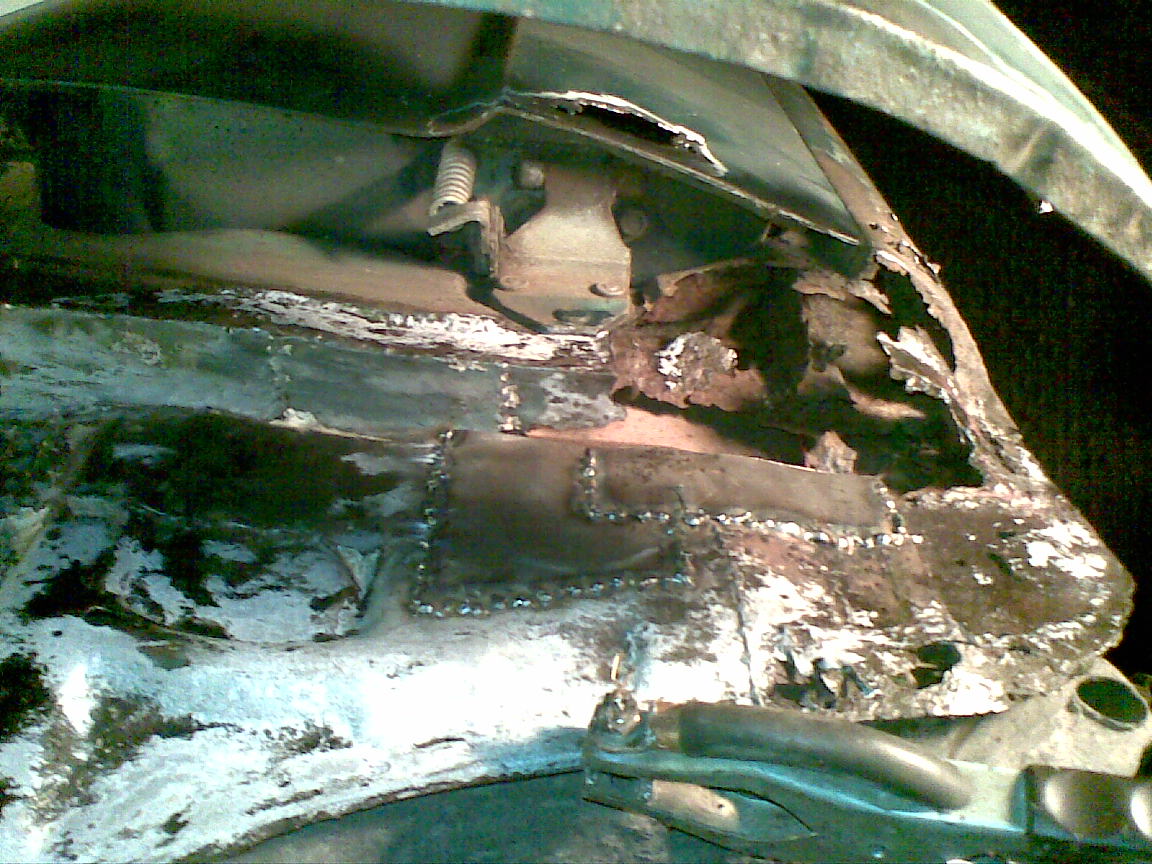 140x50 cmes darab ment bele, de nem lett elég, a hátsó sárvédő kerékív mögötti részére nem jutott ebből. az a oszlop újraépítve, mert nem volt, a padlólemez nem találkozott a belső küszöbbel, a nyúlvány fölé belement egy szép darab, és hát a kerékív eleje is hiányzott kívül-belül. na, azt ki kellett szobrászkodni rendesen. ma csinálom a másik oldalt, de az nem lesz ennyire gáz, ott megvan a padló-küszöb találkozás, "csak" foltozni kell.
