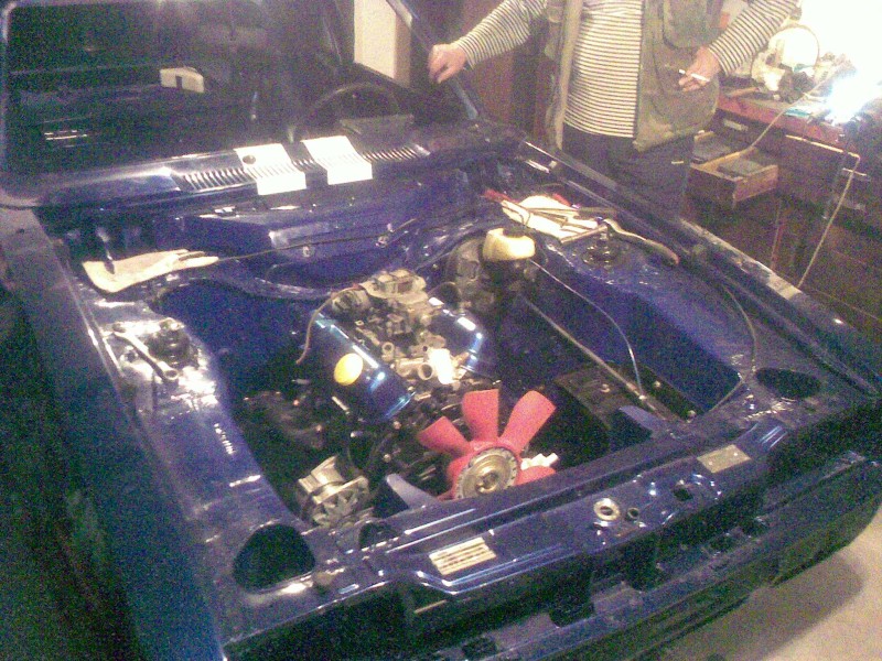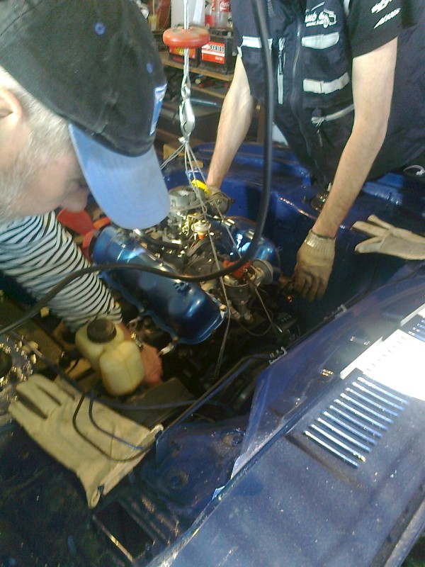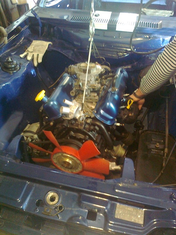 Bekerült a miaz a helyére. Hogy mit össze szoptunk, hihetetlen. Egy, hogy a csörlőn föltettük a lendkereket, kuplungot, aztán be a helyére. Már össze is ért a váltóval, csak az a szar lemez maradt ki, úgyhogy vissza az egész, kuplung, lendkerék le, kezdjük előről. A belógatáshoz a csavart a váltóharang csavarjaihoz tettük, szóval cumi volt kiszedni onnan. De az még ok, de mire lyukra játszottunk mindent mindennel, a váltót meg a motort még oké, de az a köcsög lemez örökké leesett. Mindegy, bent van.