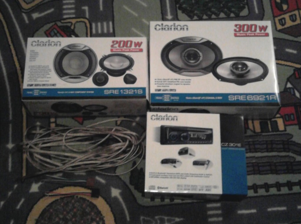 Hehe van. Megjött a Hifim. Clarion CZ301E fejegység, kék-fehér kijelzővel, MP3, USB lejátszás, Bluetooth kihangosítással. Clarion 13cm-es középsugárzó az első ajtóba, csipogókkal az A oszlop tövébe. 6x9"-os mélyközepek a kalaptartóba. 10m ezüstkábel, plusz csatlakozók. Csak ha már megunnám a V6-ot :)