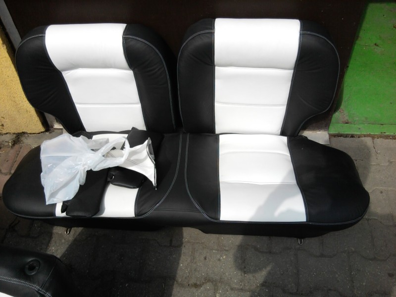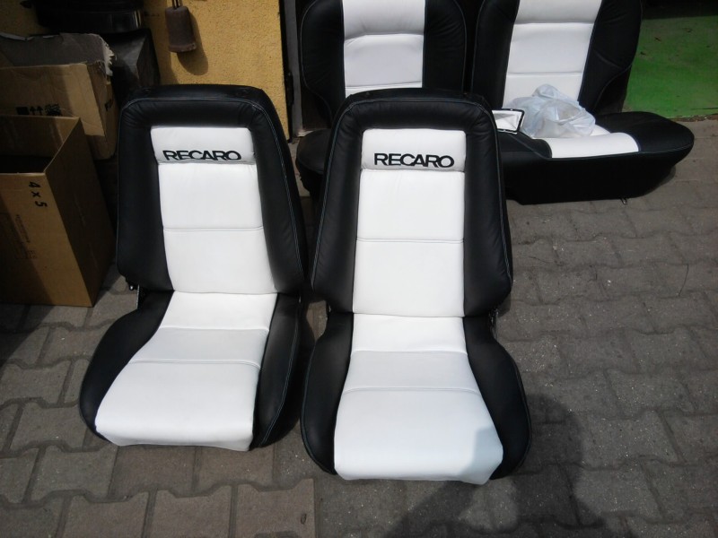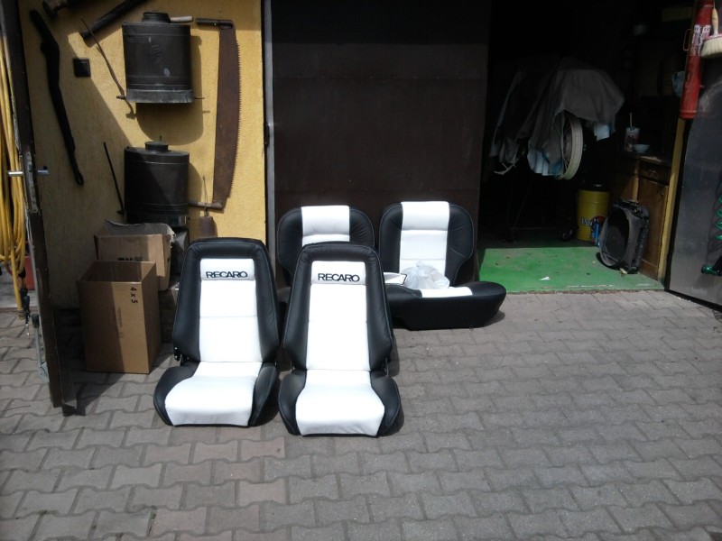 Megjöttek az ülések is. Fekete bőr fehér varrással, a fehér bőr fekete varrással, hímzett recaro logóval. Kézifékszoknya fehér bőr, váltószoknya fehér bőr, napellenzők fekete bőr. Első két ülés fűthető.