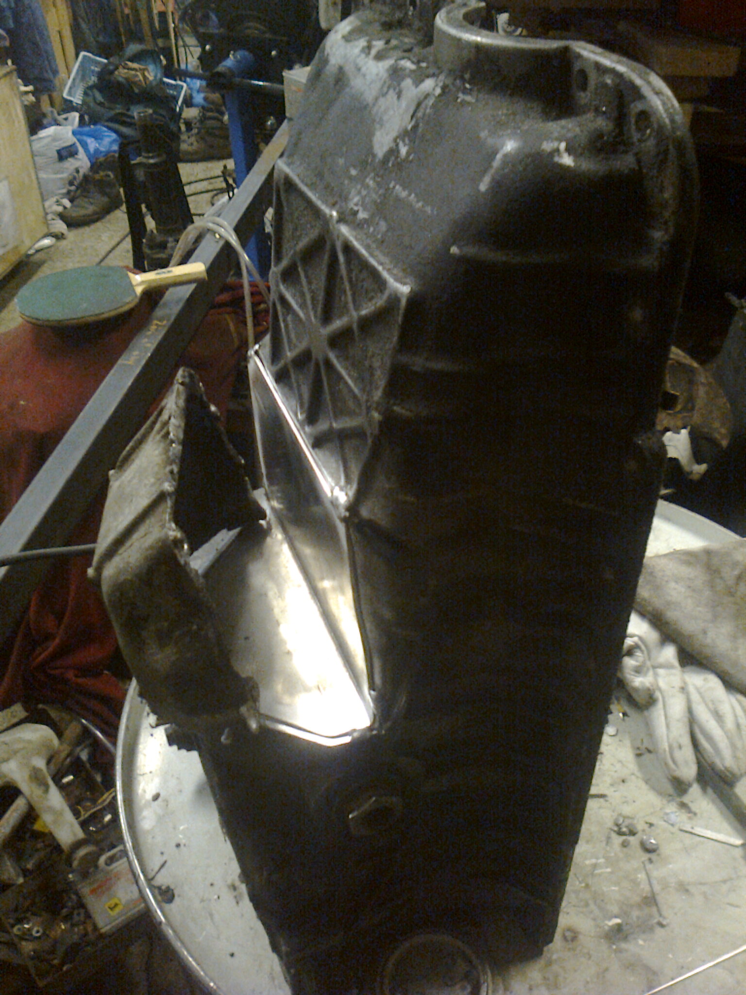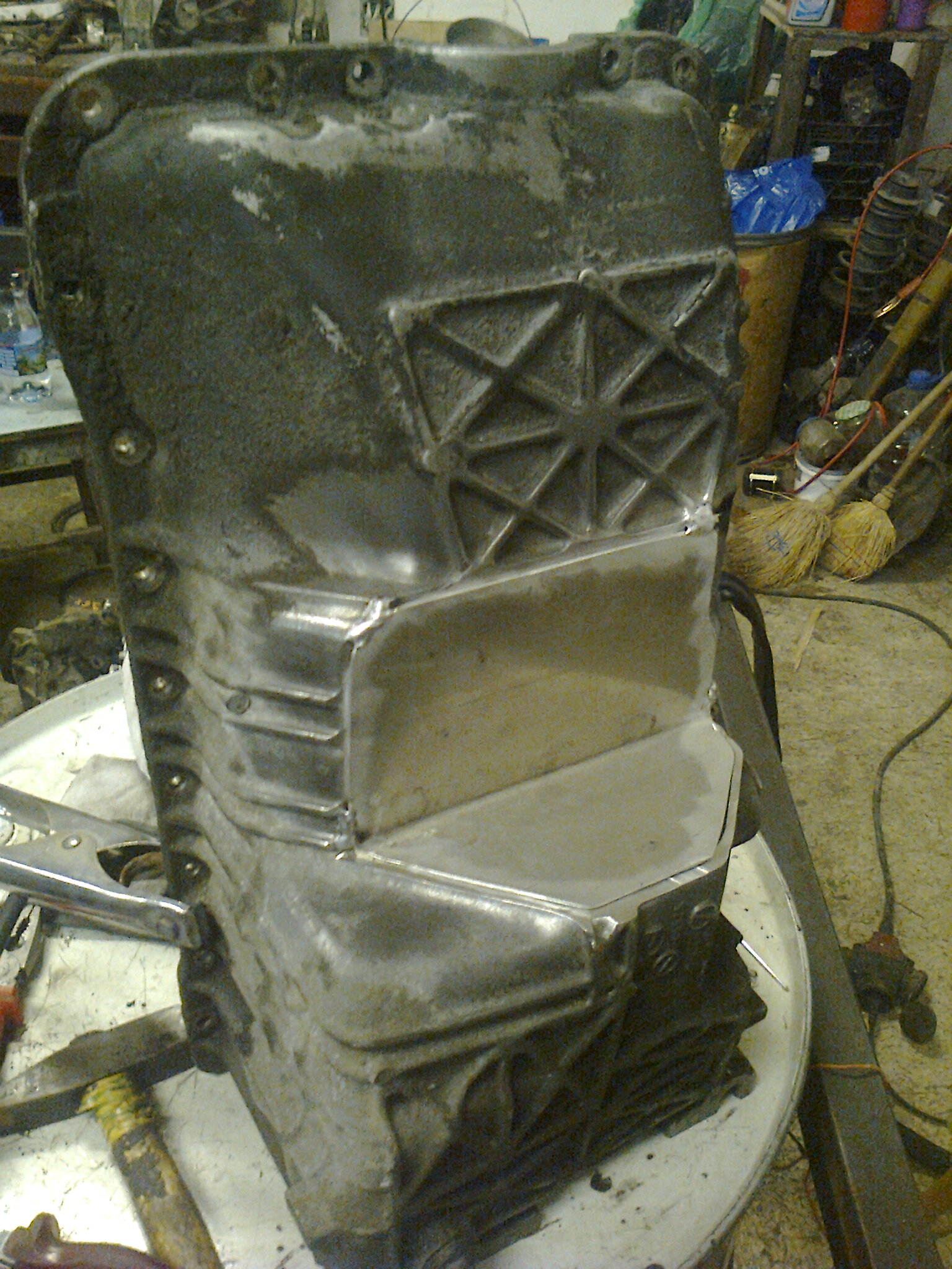 Na ezt is kipróbáltuk. Ráment pár alkalom, 1,5 palack Argon gáz, de végre sikerült elfogadható modon alut hegeszteni. Rá kellett jönni, hogy ez nem csak a parasztvakítás miatt drága dolog, hanem azért is, mert nagyon sok gáz fogy a használat közben. Így, hogy még sokat bénáztunk, a Krisz olajteknőjére elhasználtuk a 4,2 m3 palak kb 1/3-t. Ha valakinek mégis ilyen dologra lenne szüksége, "gáz árában" meg tudjuk csinálni:
